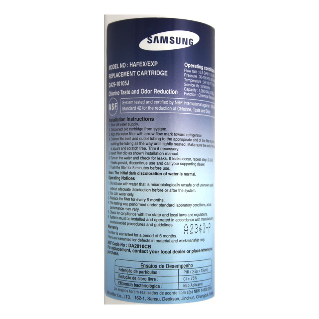 Le filtre frigo d'Origine Samsung® DA29-10105J HAFEX/EXP, Samsung®, Microfilter réduit le goût et l'odeur du chlore (jusqu'à 95.6% de réduction), rend un goût agréable de l'eau et des glaçons plus clairs.